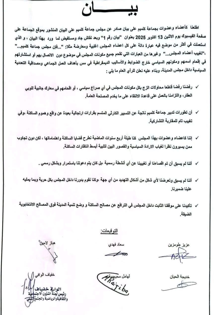 في تطور لافت يعكس عمق التصدع داخل مجلس جماعة كلميم جهة كلميم واد نون، خرج عدد من أعضاء المجلس ببيان توضيحي ناري، أعلنوا فيه رفضهم القاطع لما ورد في “البيان رقم 1″ الذي نُشر باسم المجلس على الصفحة الرسمية للجماعة في موقع التواصل الاجتماعي فيسبوك يوم الإثنين 13 أكتوبر 2025، مؤكدين أن الوثيقة لا تمثلهم ولا تعبّر عن المواقف الحقيقية لأغلبية الأعضاء ولا حتى للمعارضة.