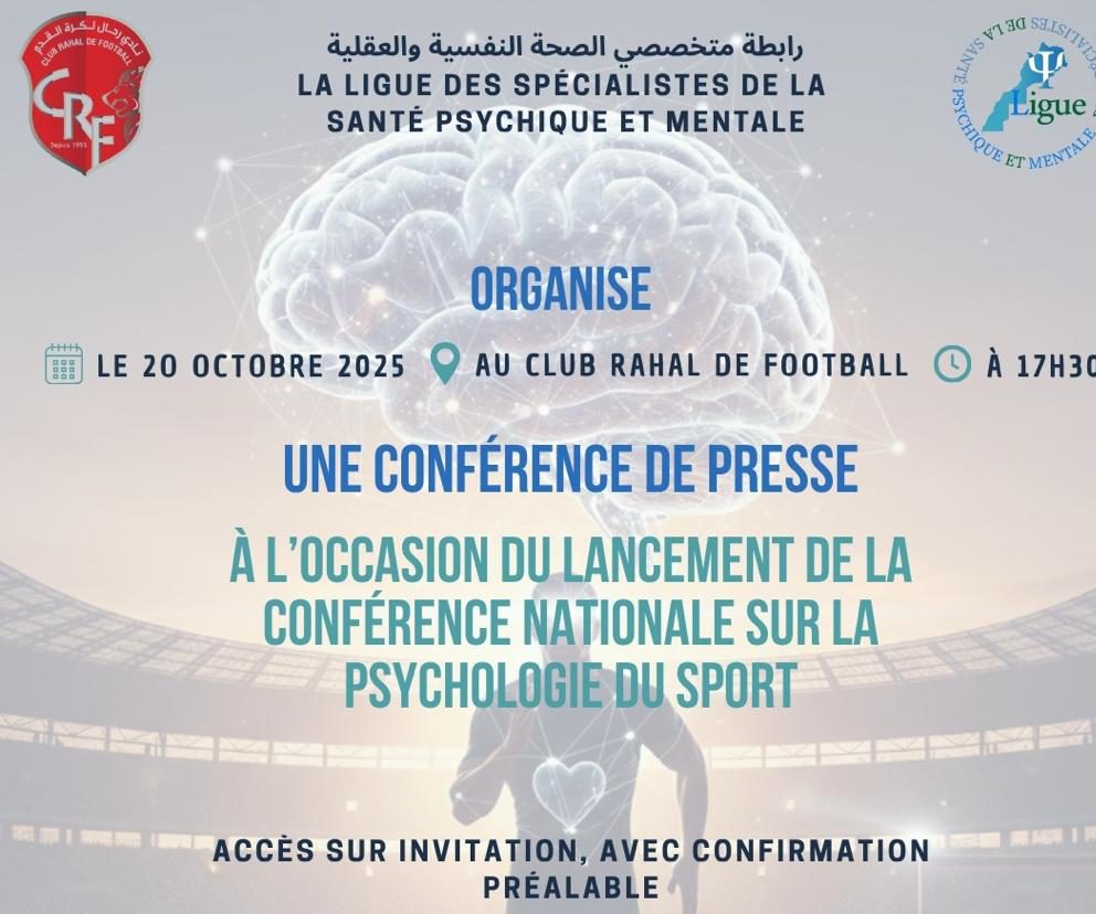 في إطار سعيها الدائم إلى النهوض بالوعي الجماعي بأهمية الصحة النفسية في مختلف مجالات الحياة، وفي مقدمتها المجال الرياضي، تُطلق رابطة متخصصي الصحة النفسية والعقلية بالمغرب مرحلة جديدة من مسارها العلمي والمهني بتنظيم الحدث الوطني الأول حول علم النفس الرياضي، تحت شعار “نحو رياضة متوازنة حيث يلتقي العقل بالجسد”.