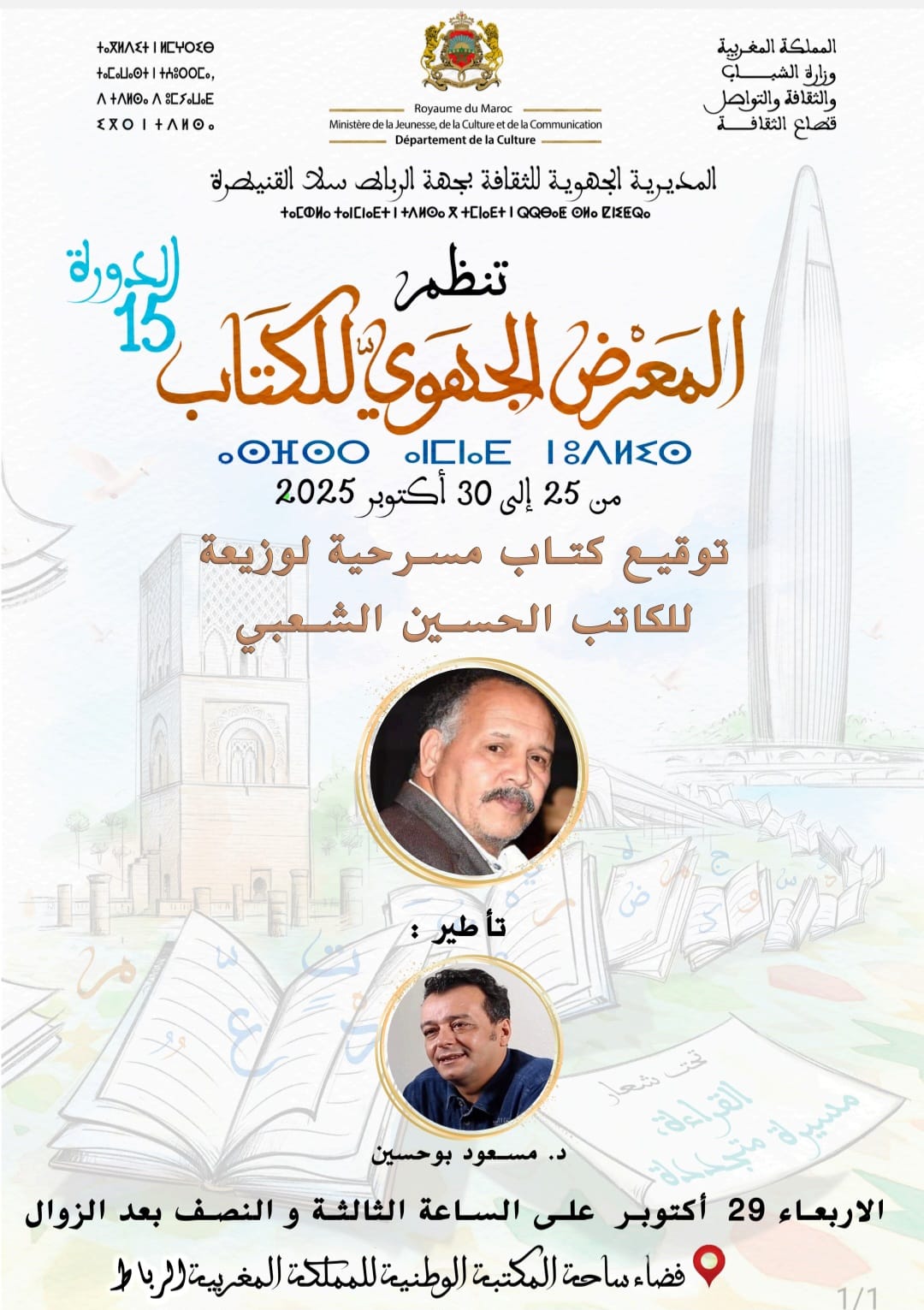 في إطار فعاليات الدورة 15 للمعرض الجهوي للكتاب بجهة الرباط سلا القنيطرة، الذي تنظمه المديرية الجهوية لوزارة الشباب والثقافة والتواصل قطاع الثقافة من 25 إلى 30 أكتوبر 2025، يحتضن فضاء ساحة المكتبة الوطنية للمملكة المغربية بالرباط حفل توقيع كتاب المسرحية ” لوزيعة ” للكاتب المسرحي الحسين الشعبي، وذلك يوم الأربعاء 29 أكتوبر على الساعة الثالثة والنصف بعد الزوال.