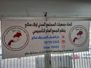 شهدت جماعة أولاد صالح يوم الأحد، 26 أكتوبر 2025، حدثًا مهمًا في المشهد الجمعوي المحلي، حيث انعقد الجمع العام التأسيسي لاتحاد جمعيات المجتمع المدني على الساعة 11 صباحًا بـدار الشباب النصر، بحضور عدد من ممثلي الجمعيات المحلية والفاعلين المدنيين المهتمين بالشأن العام.