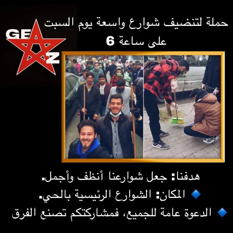 في بادرة لافتة تعكس الوعي والمسؤولية، أعلنت حركة GenZ212 عن تنظيم حملة تنظيف تطوعية يوم السبت المقبل على الساعة السادسة مساءً، وذلك تعبيرًا عن حسن النية، وردًا حضاريًا على أعمال التخريب التي رافقت بعض الاحتجاجات الأخيرة.