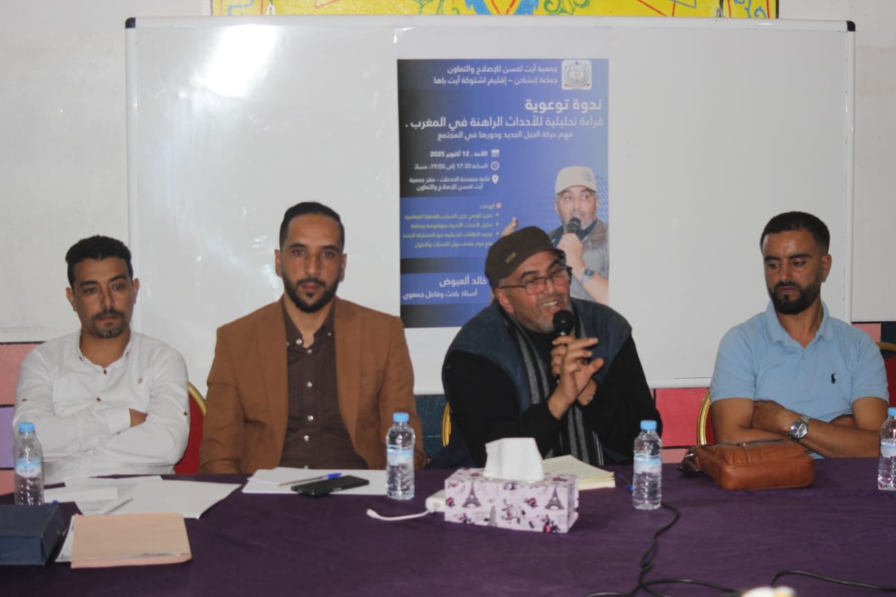 نظمت جمعية آيت الحسن للإصلاح والتعاون لقاءً فكريًا تحت عنوان “لقاء الساعة حول موضوع الأحداث الراهنة لشباب جيل Z / 2012″، أشرف على تأطيره الدكتور خالد العيوض، بحضور مكثف جمع مختلف الأجيال في نقاش مفتوح وغني بالأفكار.