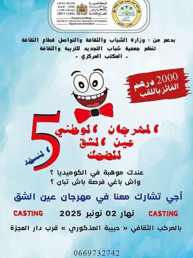 تستعد جمعية شباب التجديد للتربية والثقافة، بدعم من وزارة الشباب والثقافة والتواصل قطاع الثقافة، لتنظيم المهرجان الوطني عين الشق للضحك النسخة الخامسة، وهو حدث ثقافي وفني سنوي أصبح منصة بارزة لاكتشاف وتشجيع المواهب الكوميدية الشابة من مختلف مناطق المملكة.