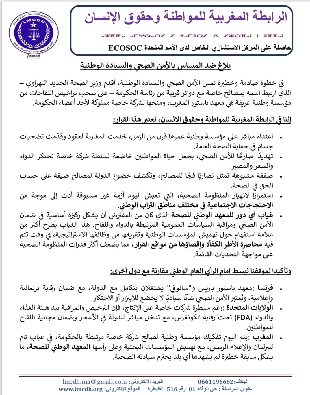 ومن منطلق الدفاع عن خدمات صحية عمومية جيدة ومستقلة عن لوبيات القطاع الصحي فإننا في الرابطة المغربية للمواطنة وحقوق الإنسان: